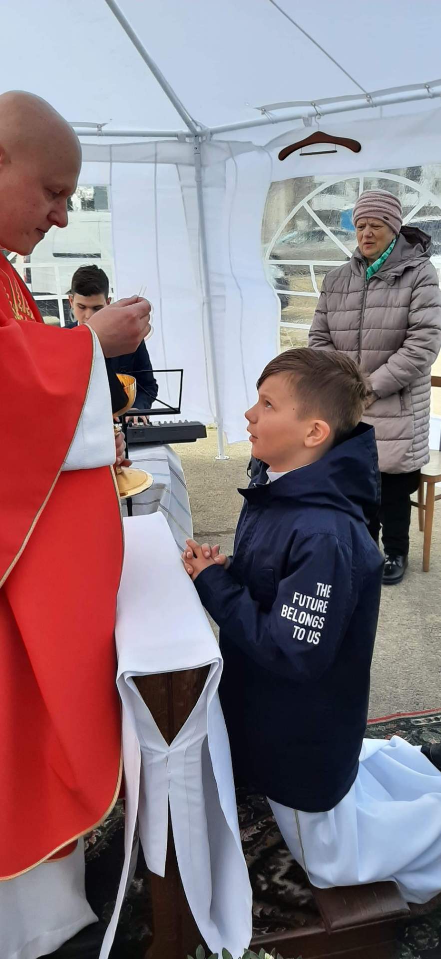 2. Wczoraj nasza wspólnota przeżywała dzień I Komunii świętej. Tutaj na placu po raz pierwszy uczestniczył w pełni we Mszy świętej Antoni a w parafii w Buku Franciszek.